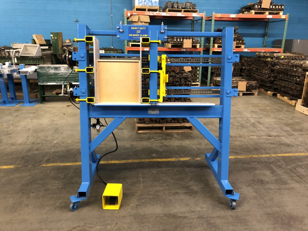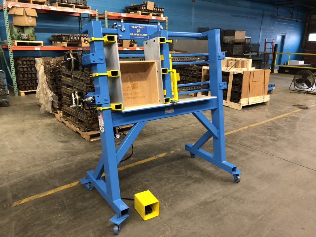 The JLT Heavy Duty Drawer Clamp is Designed to Clamp and Square all Doweled and Dovetail Drawer Construction Types. Our Design is Heavy Duty, Sturdy, Intuitive to Use, and Built to Last. It has Precise Squaring Capabilities with ample Clamping Pressure for your Boxes. A Quick Adjusting Roller Carriage Eliminated Setup Times when moving from Size to Size, and our Fast Acting Pneumatic System will Clamp and Square the Drawer in (2) Seconds.